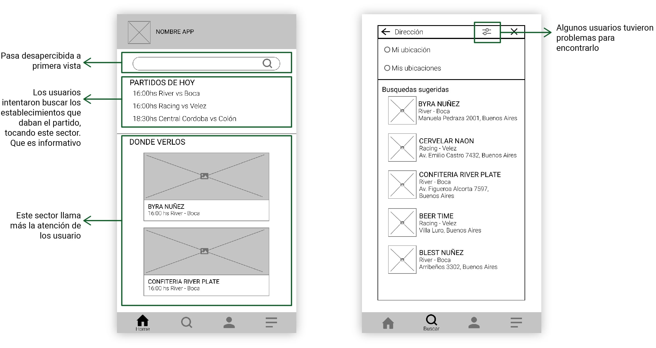 Dentro del HOME, además del inconveniente con la barra de búsqueda, el apartado informativo sobre los partidos de la fecha generó confusión, los usuarios intentaron utilizarlo como forma de búsqueda, tocando sobre un partido y esperando que los lleve a una lista de establecimientos donde se emitiera ese partido.