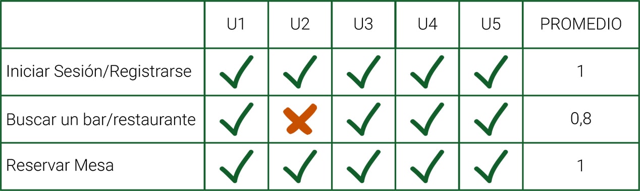 *Debido a que las primeras dos personas testeadas realizaron la reserva en el bar sugerido en el home, sin utilizar la búsqueda, se modificó la tarea para los siguientes usuarios. La misma pasó a ser: Usando la opción de búsqueda, encontra un bar donde den el superclásico y reserva una mesa para vos y tus dos amigos.