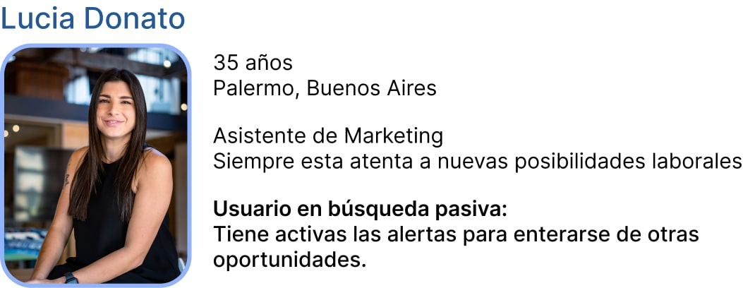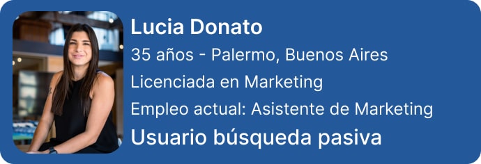 Lucia estudio Licenciatura en Marketing, luego de recibirse comenzó a trabajar en una agencia de publicidad. Pasó por varias, actualmente es asistente de Marketing en una empresa multinacional. Todo el tiempo esta atenta a nuevas oportunidades laborales, que le ofrezcan una posibilidad para seguir creciendo o una mejora en su sueldo.