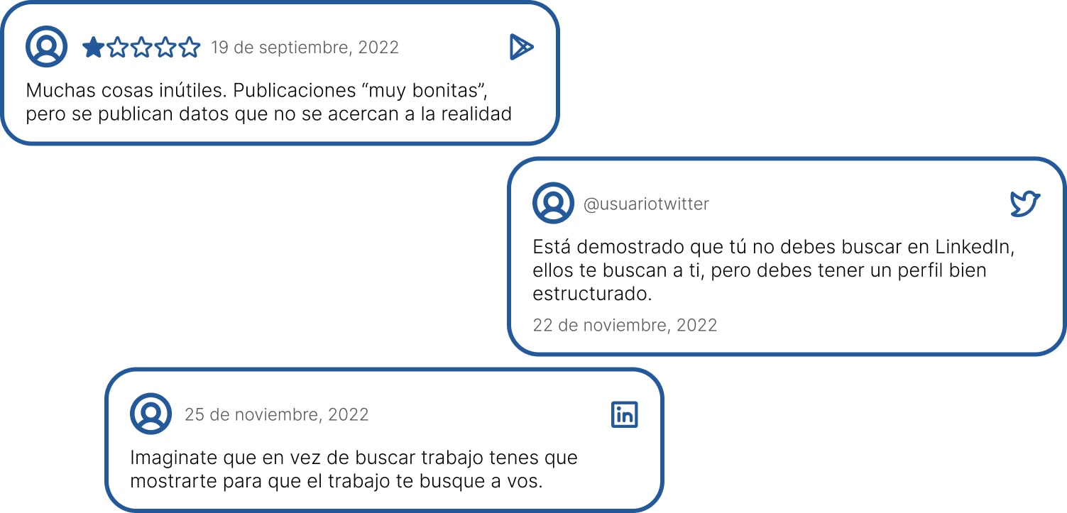 Observando el inicio de LinkedIn, se pueden encontrar varias opiniones de los usuarios mostrando su descontento ya que hace tiempo que buscan empleo y no logran encontrarlo, mencionan que no encuentran ofertas laborales y que muchas publicaciones no tienen que ver con lo laboral.