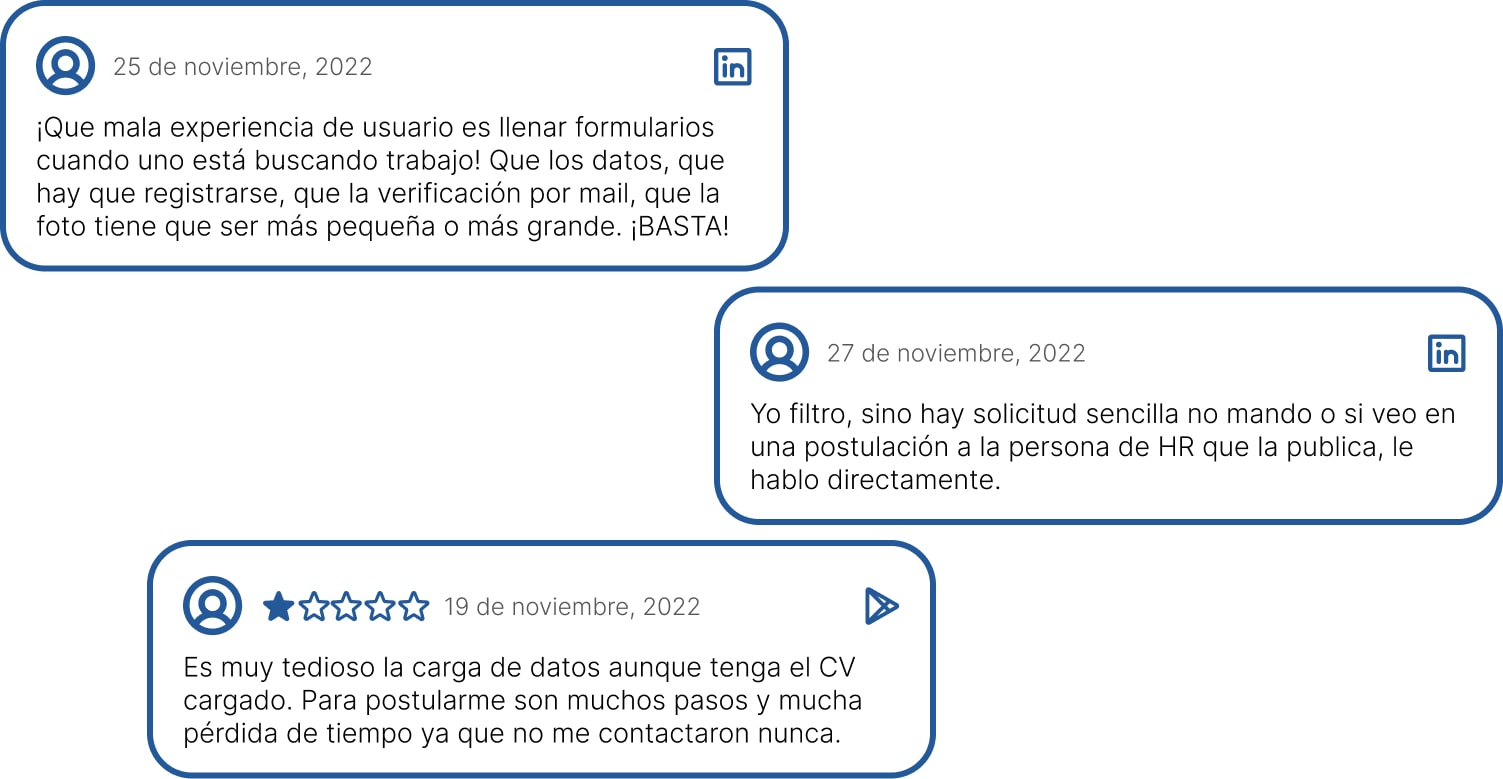 Los usuarios consideran la postulación externa, cuando tienen que volver a completar todo su CV o hacerse un usuario en otra plataforma, como un proceso tedioso y repetitivo, que les consume mucho tiempo y energía. Algunos desechan ofertas que tienen este tipo de postulación por ese motivo, otros las guardan para enviarlas después, cuando tengan mas tiempo, y ese momento nunca llega porque se olvidan.